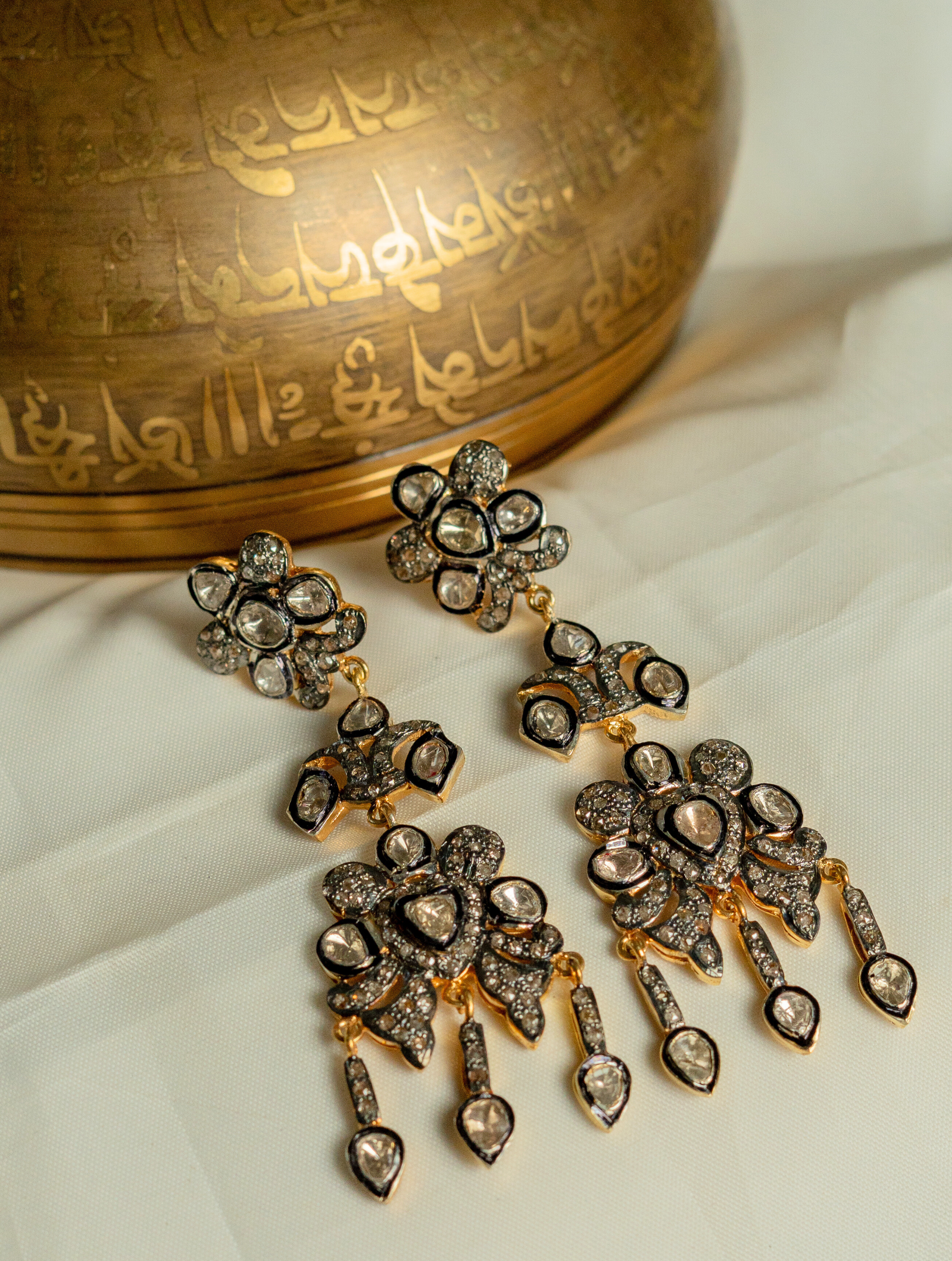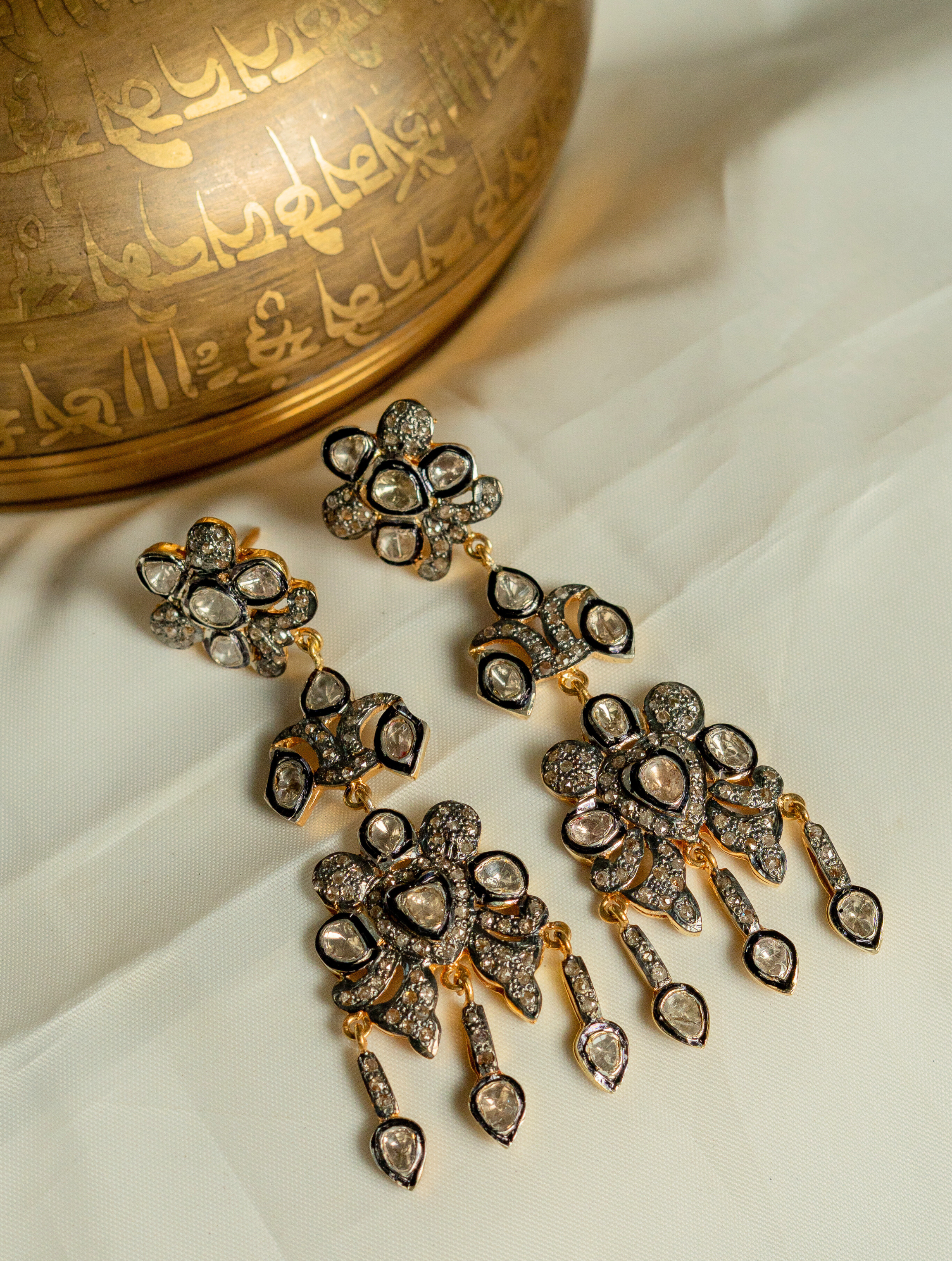 Bathed in the hushed glow of Chandni, these layered danglers are composed like a nocturne—where moonlight drapes itself in quiet drama. Each cascading tier unfolds with intention, echoing the slow reveal of the moon as it claims the night. Hand-set polki diamonds preserve the romance of ancestral craftsmanship, while fine diamonds glimmer like constellations suspended in silver air. Designed to move with sculptural grace, the layers create a rhythm of light, shadow, and fluid elegance. The Chandni Polki and Diamond Layered Danglers are not worn—they are inhabited, a statement of nocturnal luxury and timeless allure.