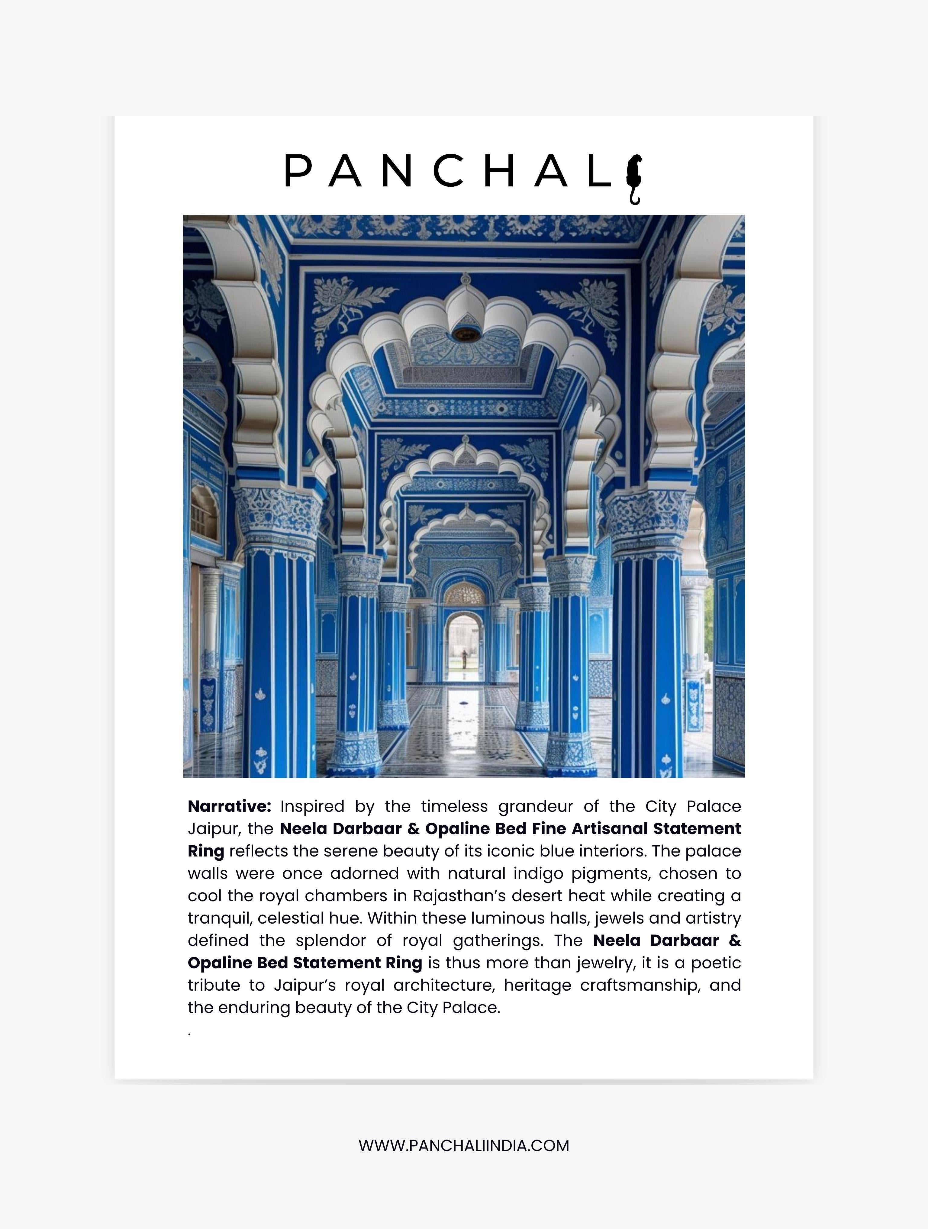 Inspired by the timeless grandeur of the City Palace Jaipur, the Neela Darbaar & Opaline Bed Fine Artisanal Statement Ring reflects the serene beauty of its iconic blue interiors. The palace walls were once adorned with natural indigo pigments, chosen to cool the royal chambers in Rajasthan’s desert heat while creating a tranquil, celestial hue. Within these luminous halls, jewels and artistry defined the splendor of royal gatherings. The Neela Darbaar & Opaline Bed Statement Ring is thus more than jewelry, it is a poetic tribute to Jaipur’s royal architecture, heritage craftsmanship, and the enduring beauty of the City Palace.