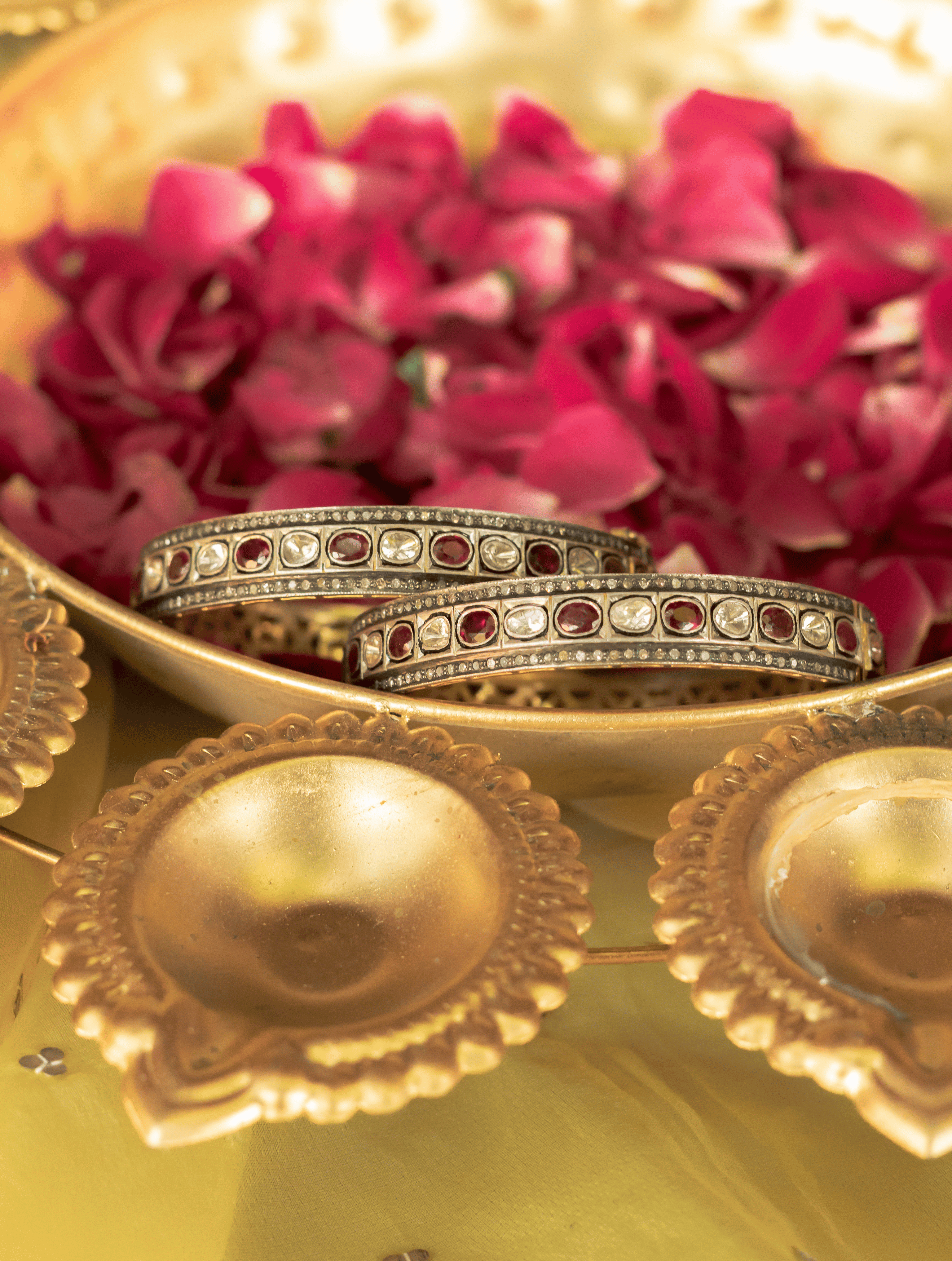 There was a woman once whose presence could alter the atmosphere of an entire court who was known for her refined taste, poetic sensibility, and a power that felt effortless rather than declared. Named after Noor Jahan, the legendary empress whose name meant Light of the World, this Noor Polki Diamond & Ruby Bangle Set reflects a radiance that feels both regal and intimate. The uncut Polki diamonds carry an old, natural glow, while the rubies add a deep warmth reminiscent of royal chambers and whispered poetry. Its design balances strength with softness, much like the woman who inspired it.