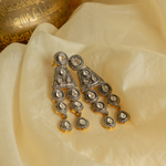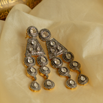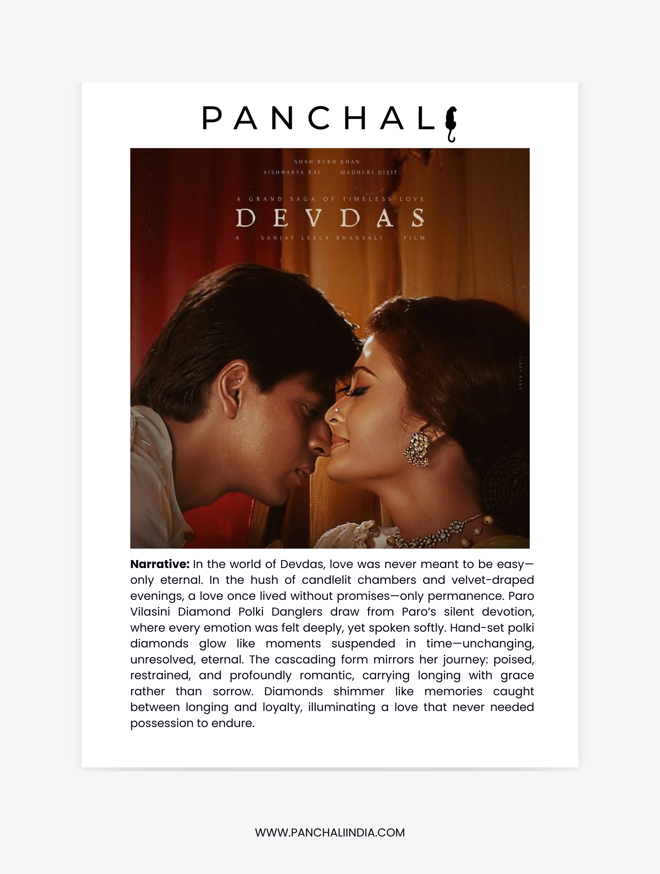 In the world of Devdas, love was never meant to be easy—only eternal. In the hush of candlelit chambers and velvet-draped evenings, a love once lived without promises—only permanence. Paro Vilasini Diamond Polki Danglers draw from Paro’s silent devotion, where every emotion was felt deeply, yet spoken softly. Hand-set polki diamonds glow like moments suspended in time—unchanging, unresolved, eternal. The cascading form mirrors her journey: poised, restrained, and profoundly romantic, carrying longing with grace rather than sorrow. Diamonds shimmer like memories caught between longing and loyalty, illuminating a love that never needed possession to endure. Crafted for the woman who understands that true love, like in Devdas, lingers long after the last glance—these danglers are a tribute to love that never needed an ending.