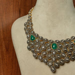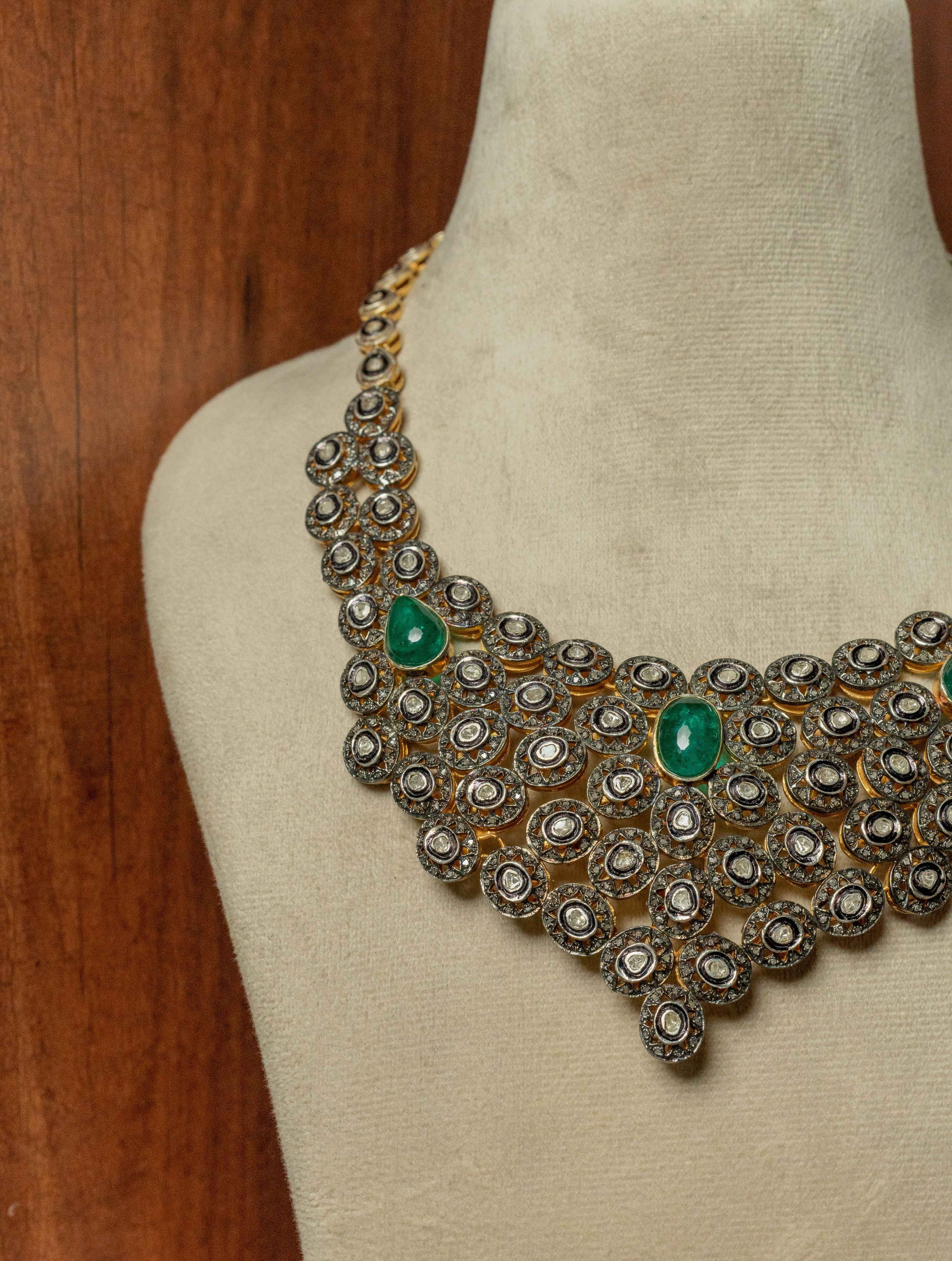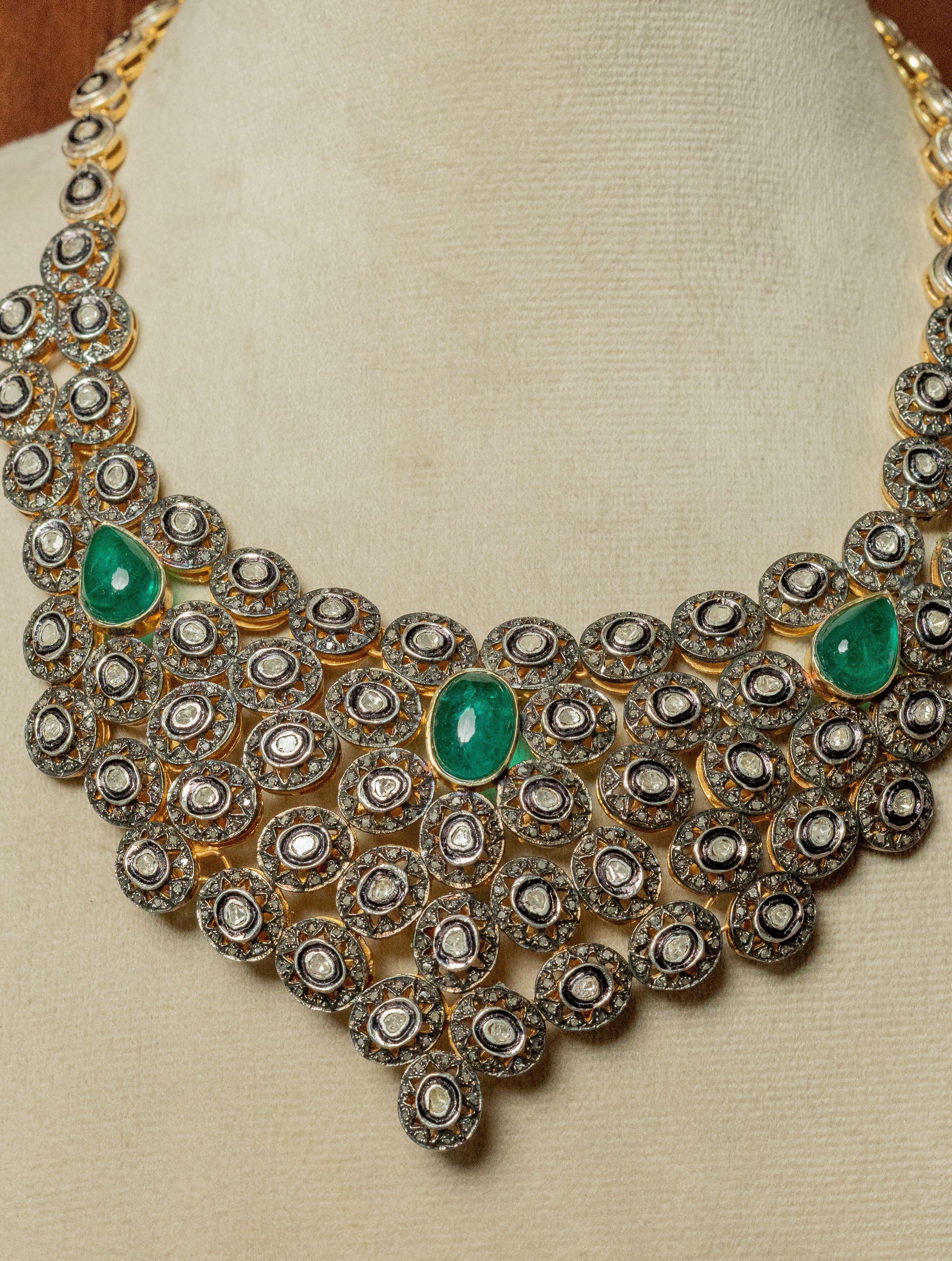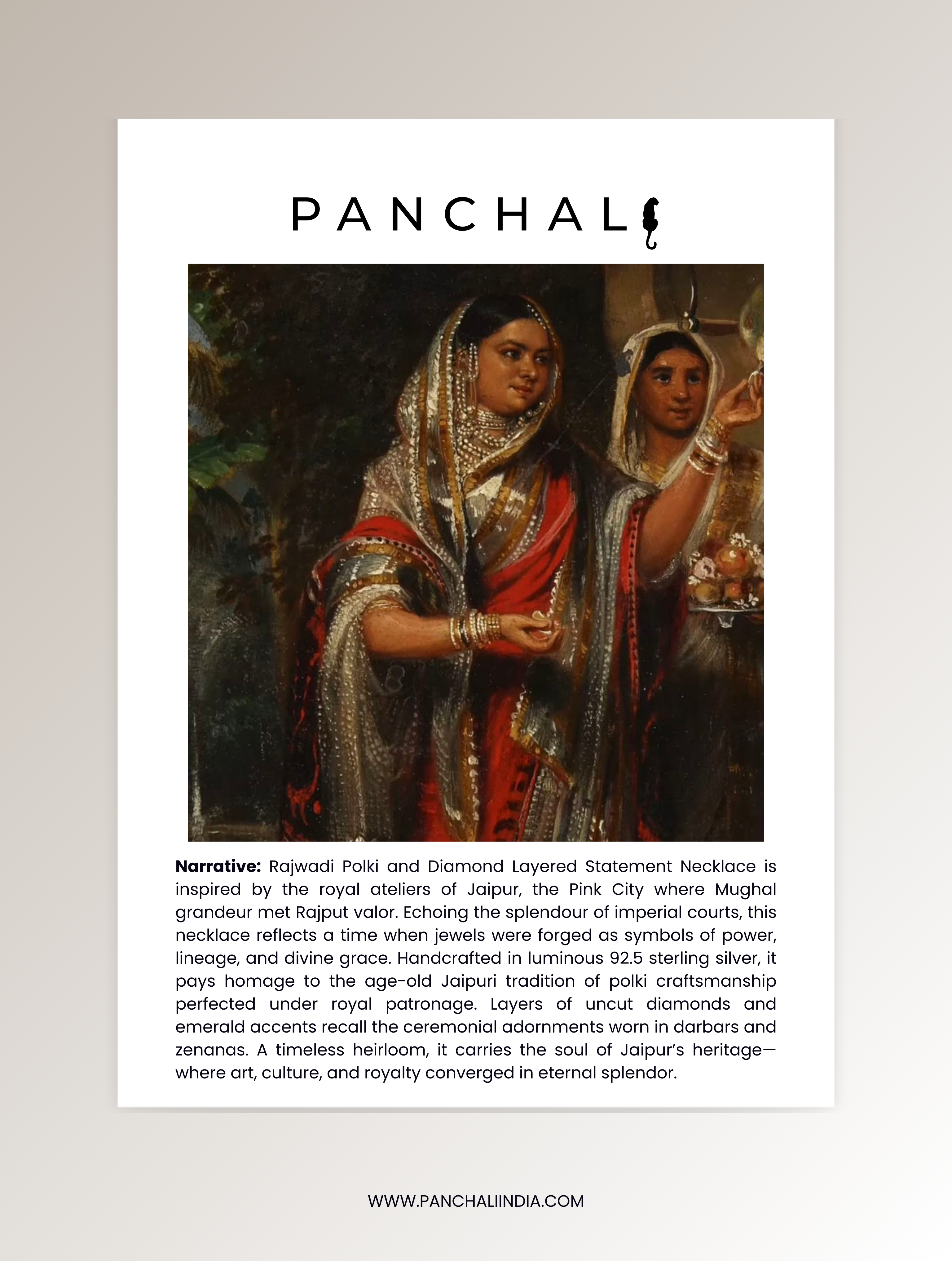 Rajwadi Polki and Diamond Layered Statement Necklace is inspired by the royal ateliers of Jaipur, the Pink City where Mughal grandeur met Rajput valor. Echoing the splendour of imperial courts, this necklace reflects a time when jewels were forged as symbols of power, lineage, and divine grace. Handcrafted in luminous 92.5 sterling silver, it pays homage to the age-old Jaipuri tradition of polki craftsmanship perfected under royal patronage. Layers of uncut diamonds and emerald accents recall the ceremonial adornments worn in darbars and zenanas. A timeless heirloom, it carries the soul of Jaipur’s heritage—where art, culture, and royalty converged in eternal splendor.