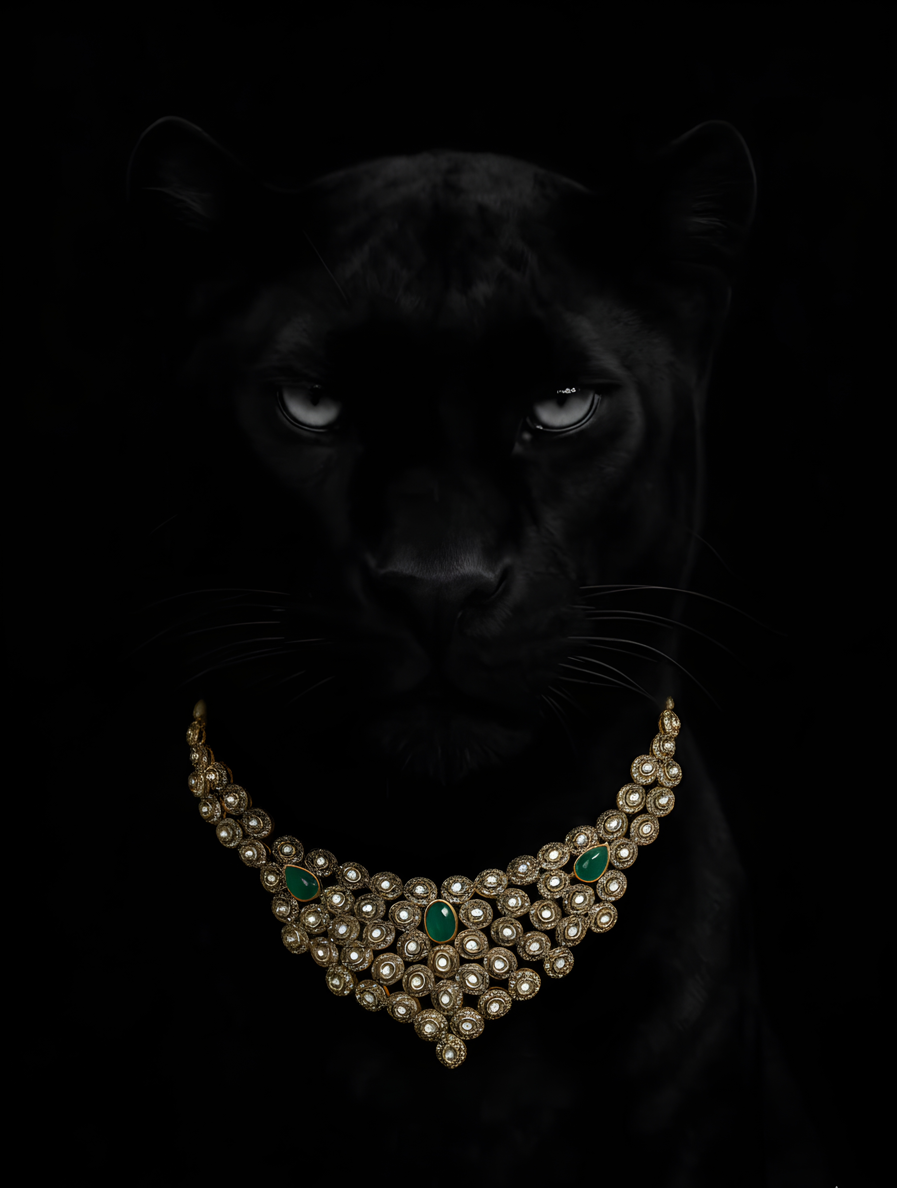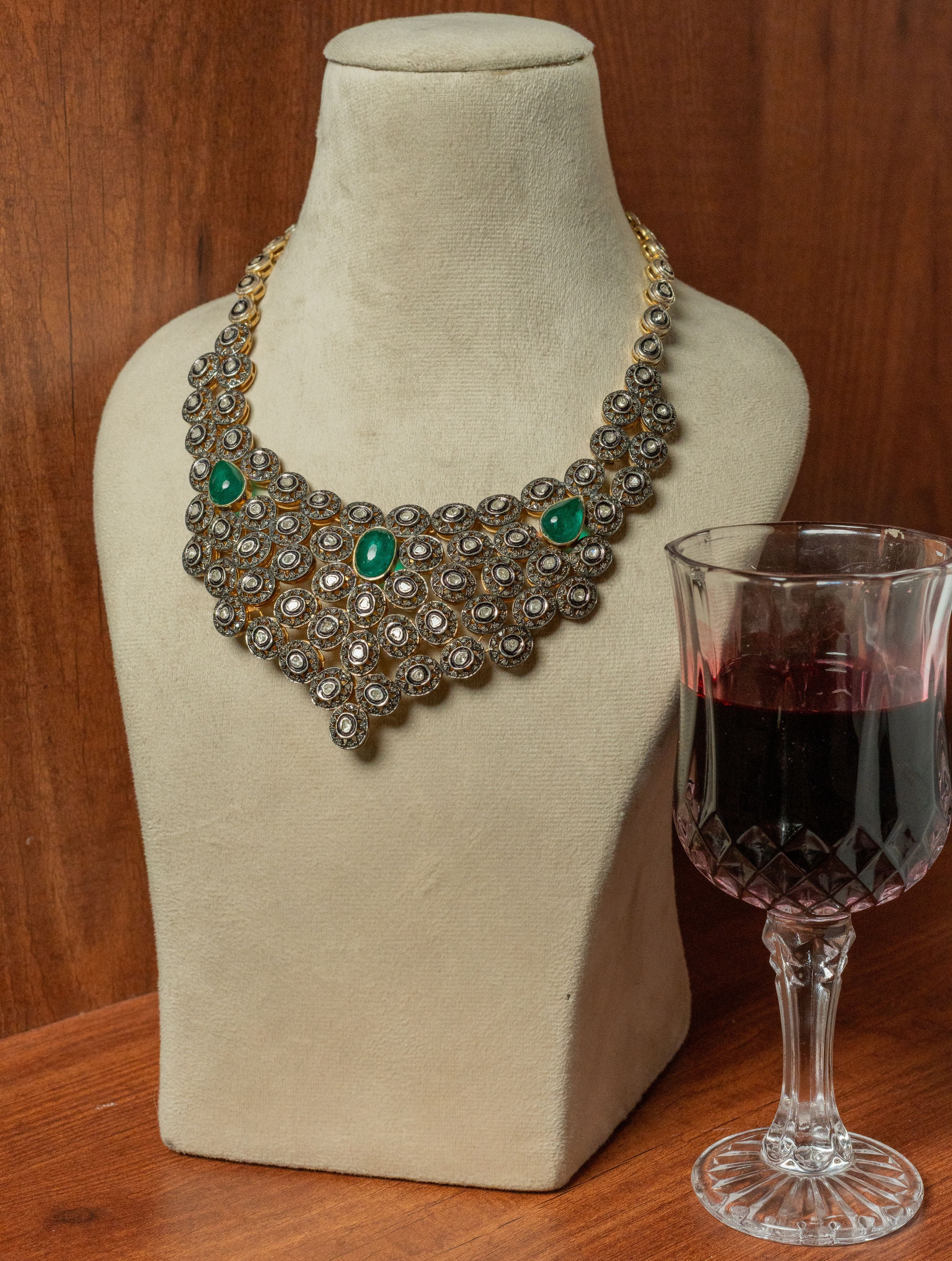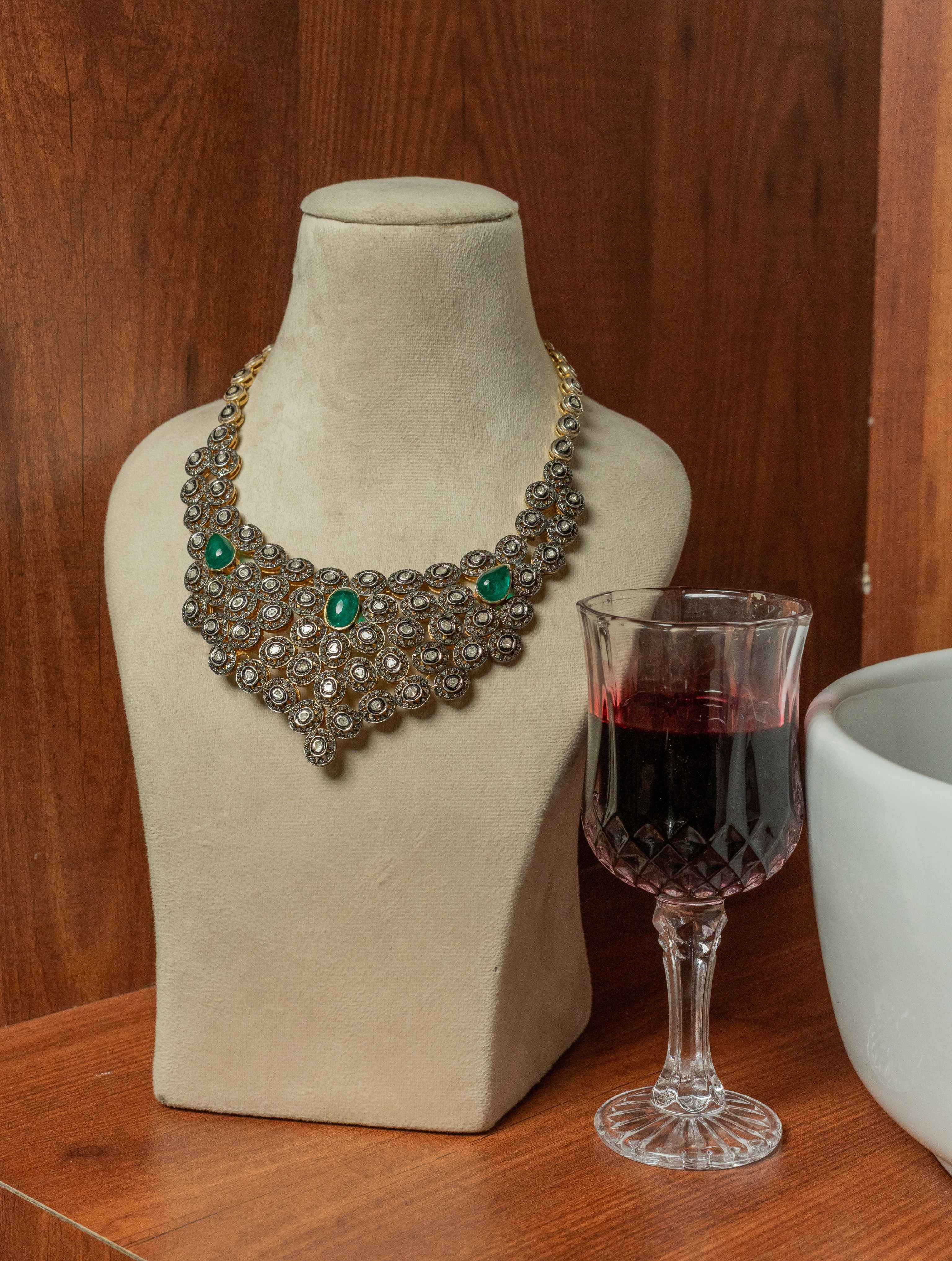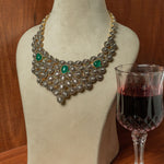 Rajwadi Polki and Diamond Layered Statement Necklace is inspired by the royal ateliers of Jaipur, the Pink City where Mughal grandeur met Rajput valor. Echoing the splendour of imperial courts, this necklace reflects a time when jewels were forged as symbols of power, lineage, and divine grace. Handcrafted in luminous 92.5 sterling silver, it pays homage to the age-old Jaipuri tradition of polki craftsmanship perfected under royal patronage. Layers of uncut diamonds and emerald accents recall the ceremonial adornments worn in darbars and zenanas. A timeless heirloom, it carries the soul of Jaipur’s heritage—where art, culture, and royalty converged in eternal splendor.